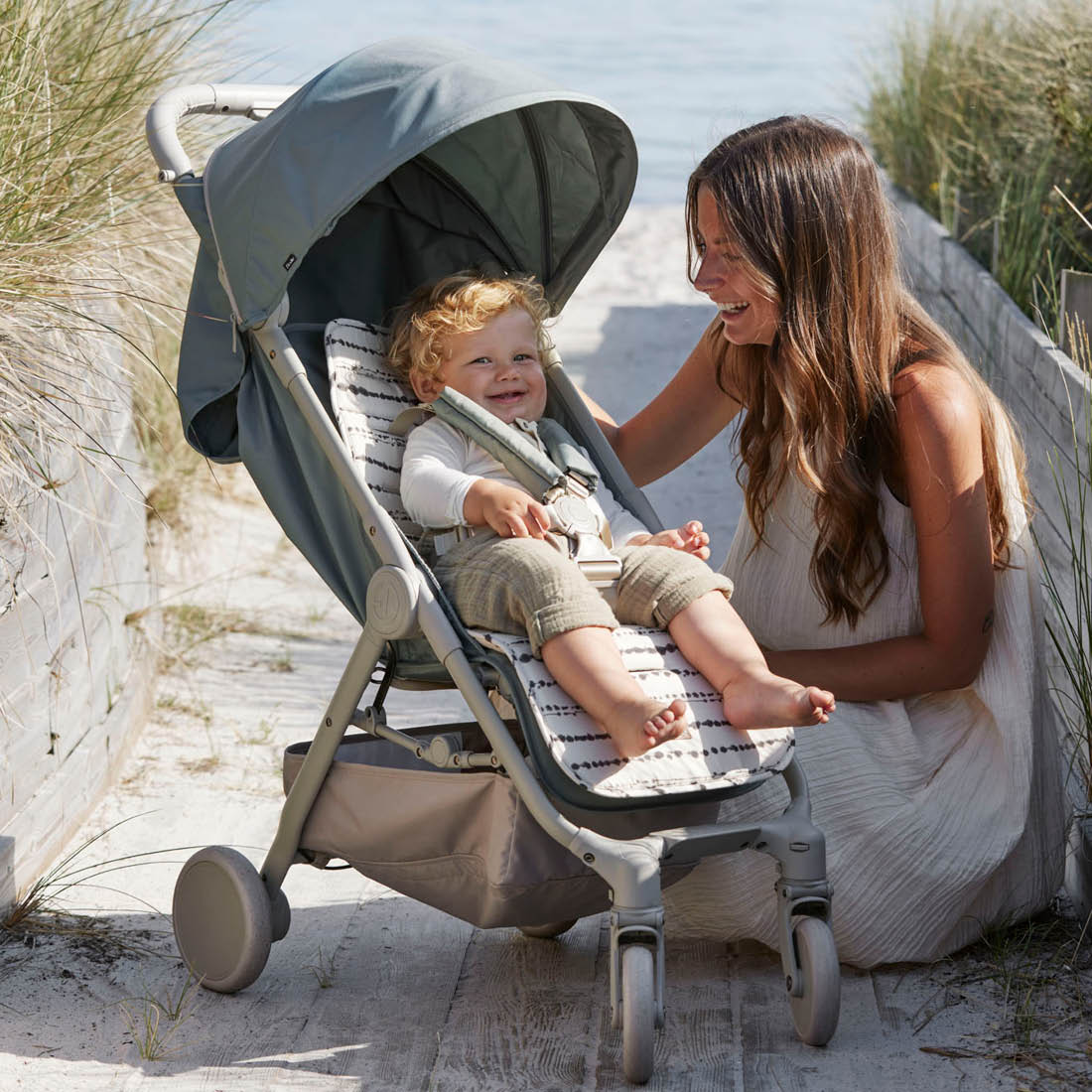 Dirección con una sola mano, ruedas plegables y silenciosas que, gracias a un avanzado proceso de I+D, ofrecen a ti y a tu hijo una experiencia de paseo suave, sin importar la superficie. Se pliega en un segundo con una sola mano y se puede llevar al hombro con la práctica correa de hombro disponible como accesorio.