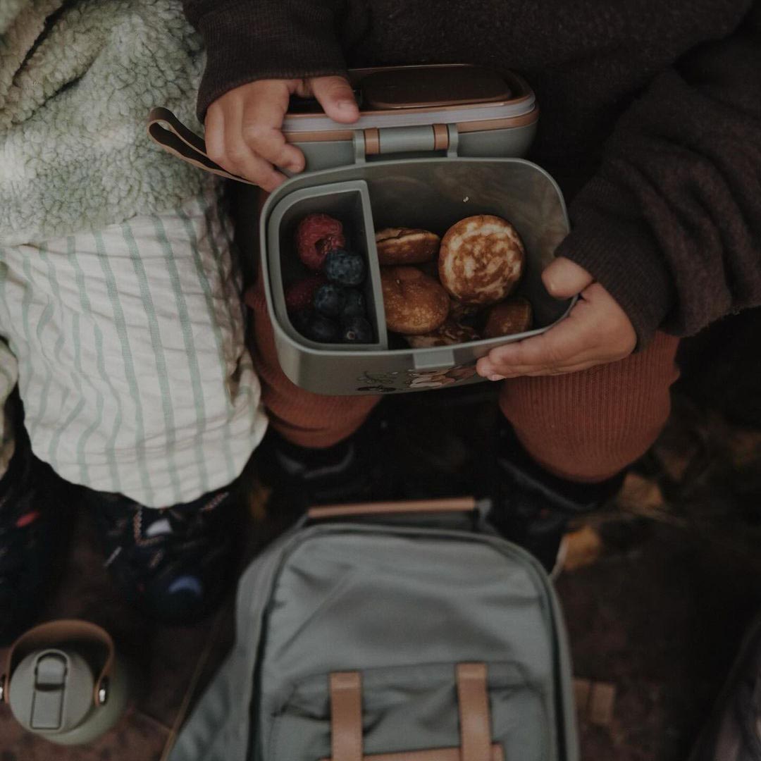 Este adorable recipiente cuenta con varios compartimentos para mantener los alimentos separados y frescos durante mucho tiempo. La tapa está revestida con un anillo de silicona de grado alimenticio que la hace completamente hermética y ayuda a conservar la frescura de los alimentos o refrigerios por más tiempo. Para mayor facilidad de uso, se puede lavar a máquina y guardar en el congelador. Su tamaño cabe perfectamente en una mochila Elodie BackPack MINI junto con nuestra botella de agua de acero inoxidable. Los materiales utilizados en este producto están 100 % libres de sustancias nocivas como BPA o ftalatos. Apto para niños a partir de 3 años.