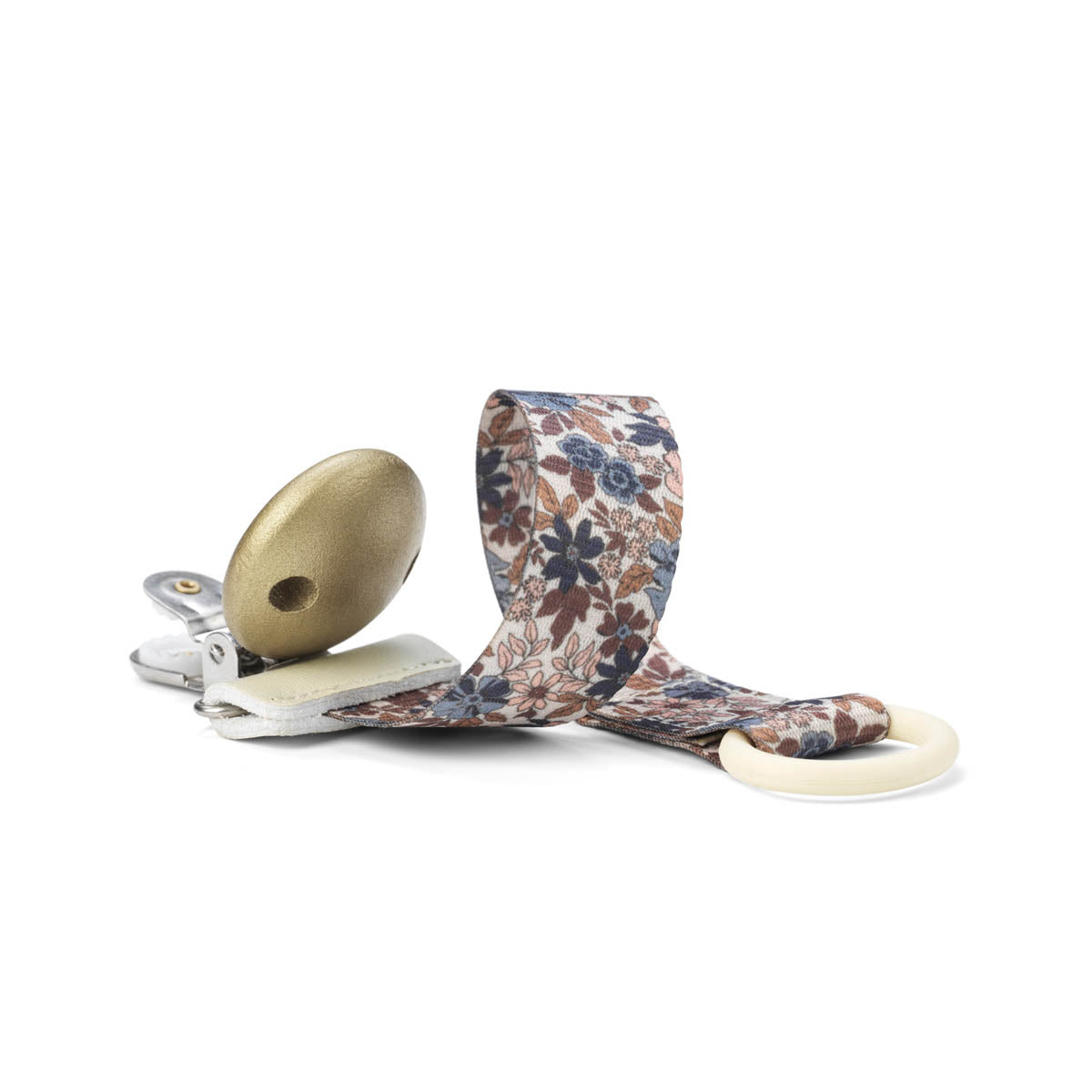 El clip para chupete de Elodie, nuestro producto insignia, asegura que el chupete nunca se pierda ni ensucie. Fabricado con hebilla de acero inoxidable hipoalergénico, correa de poliéster reciclado y detalles en cuero vegano. Compatible con cualquier chupete y aprobado por normas de seguridad.