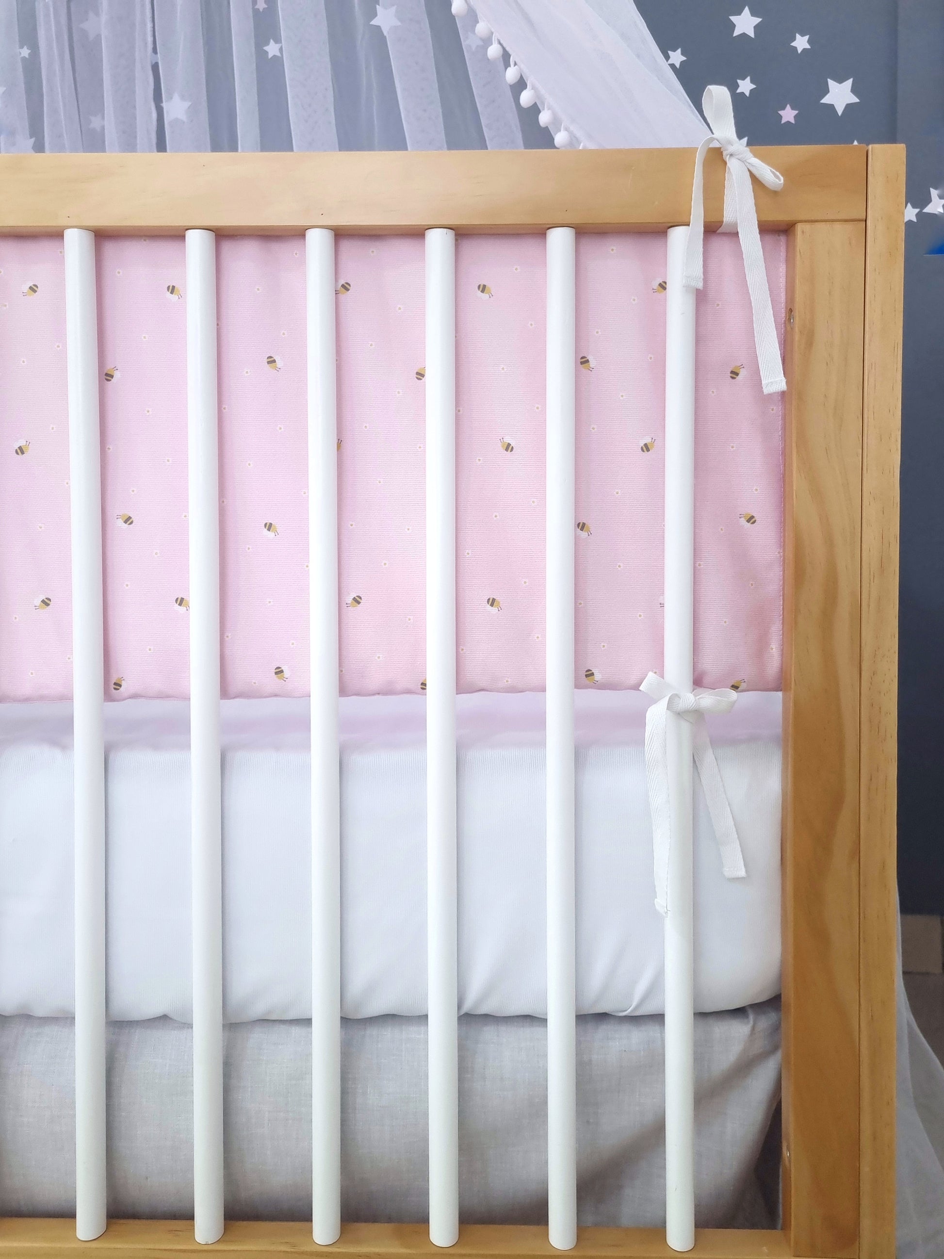 Recomendamos dejar una separación de 4 dedos entre el protector de cuna y el colchón para que la cuna esté bien ventilada y puedas observarlo.