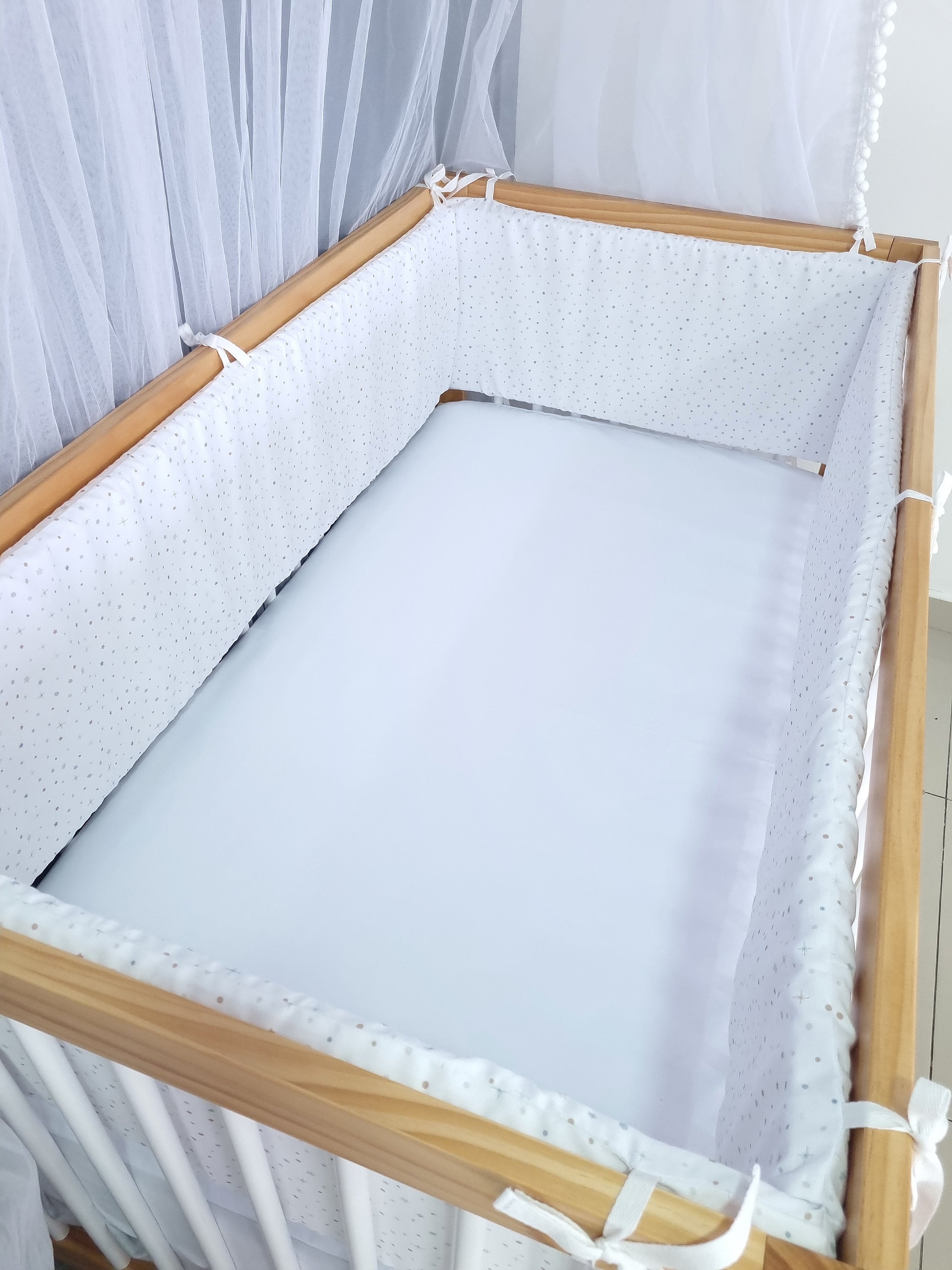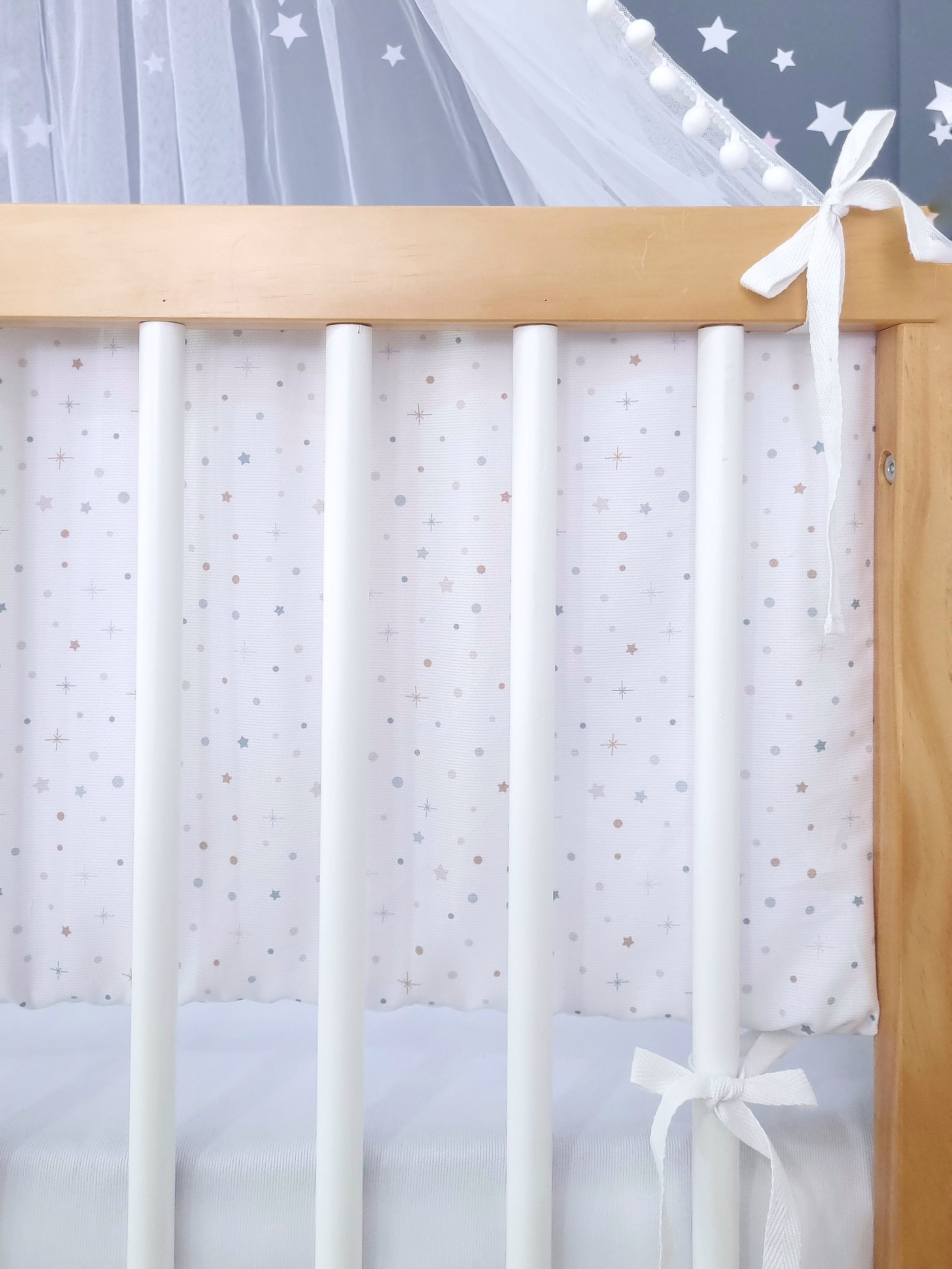 Recomendamos dejar una separación de 4 dedos entre el protector de cuna y el colchón para que la cuna esté bien ventilada y puedas observarlo.