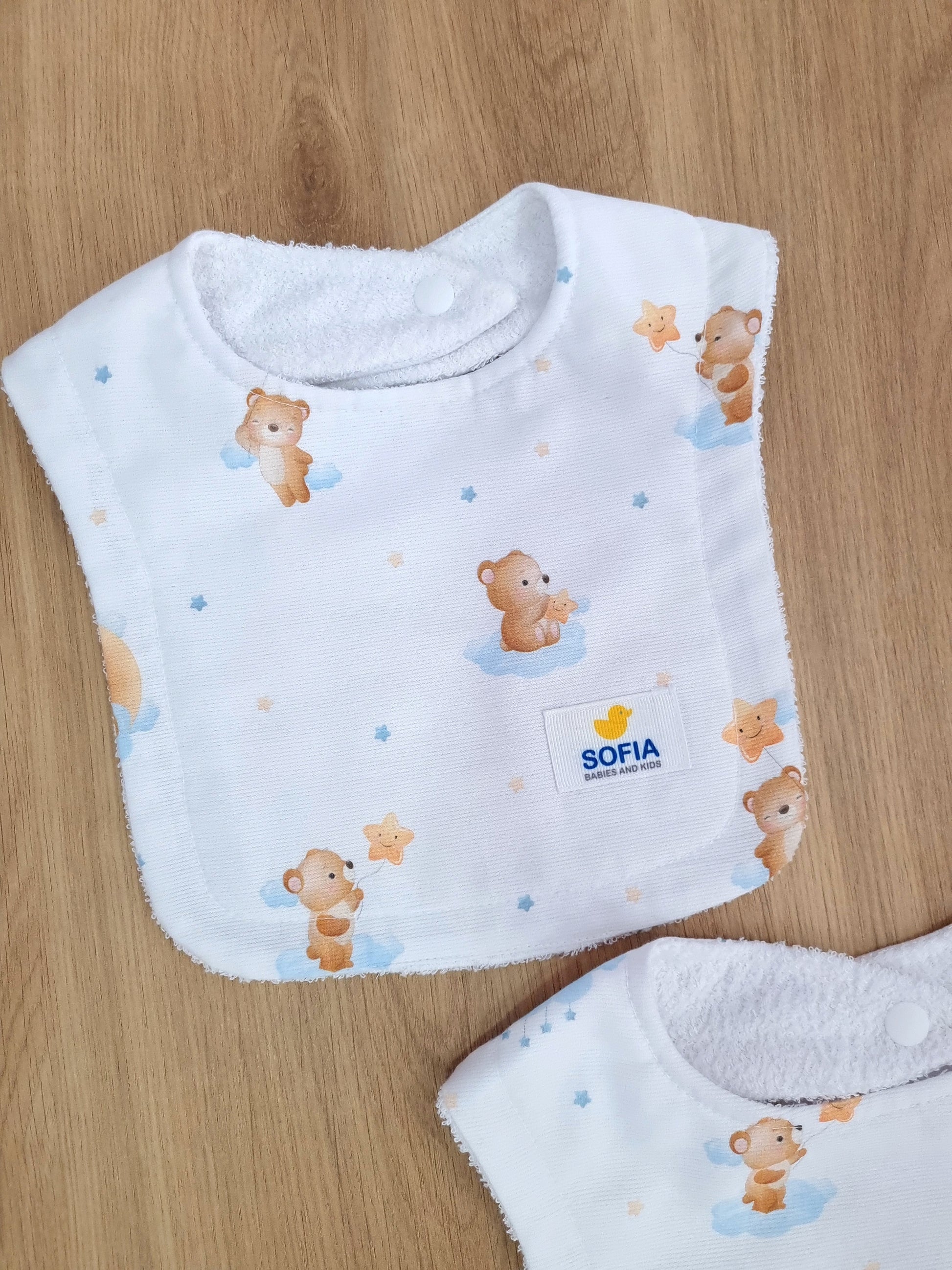 Set de 2 baberos con diseño amplio para proteger la ropa de tu bebé, tienen 2 largos ajustables con broches por lo que los puedes usar desde los 0 meses hasta los 3 años o más.