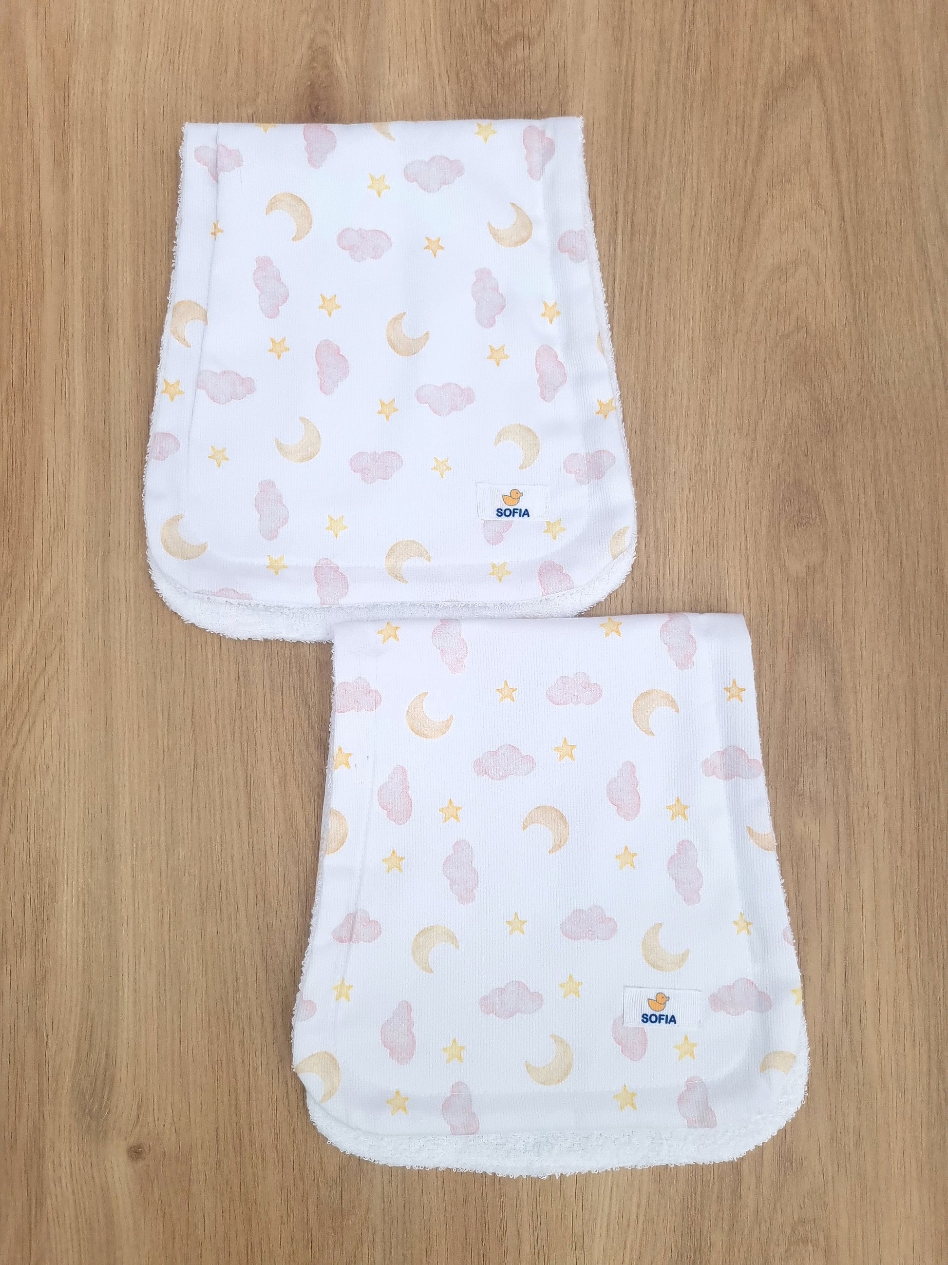 Set de 2 saliveros. Son un verdadero elemento esencial para el primer año, nuestras toallas saliveras son amplias y protegen la ropa de los padres de babas, manchas y regurgitaciones y te servirán para limpiar también a tu bebé como una toallita de mano.